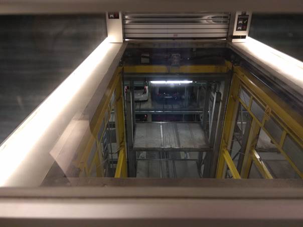 Потом приходишь, платишь той же кредиткой и тебе компьютер говорит в какой кабинке твоя машина. Ждешь пару минут (при этом на дисплее показывают конкретные шаги и видео твоей машины) и потом пол в кабинке (за дверью, ясное дело, но его все равно видно) пропадает