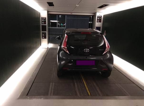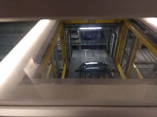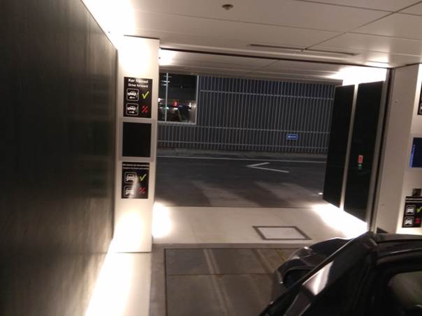 Потом приходишь, платишь той же кредиткой и тебе компьютер говорит в какой кабинке твоя машина. Ждешь пару минут (при этом на дисплее показывают конкретные шаги и видео твоей машины) и потом пол в кабинке (за дверью, ясное дело, но его все равно видно) пропадает