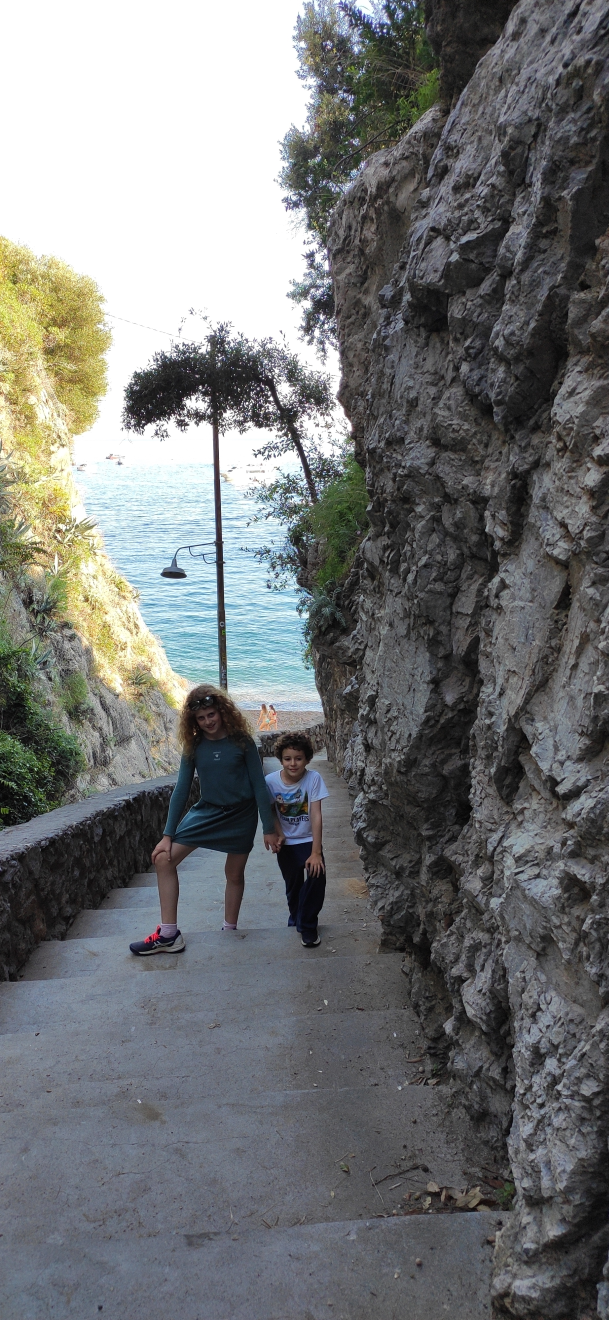 На следующий день мы поехали на Амальфитанское побережье. Вдоль побережья проходит, на мой взгляд, самая красивая дорога в мире. Однако и ехать по ней достаточно сложно, потому что она состоит только из поворотов и не рассчитана на ширину современных автомобилей. Поэтому мы предпочитали не брать машину на прокат, а поехать на общественном транспорте. До Сорренто на электричке, которую Google называет L1. Это вводит в заблуждение, поскольку в самом Неаполе также есть линия метро L1. Если вы хотите поехать в Сорренто, вам нужно перейти на линию Circumvesuviane (в самом конце станции Garibaldi и там сесть на поезд до Сорренто. Ну а потом просто пересесть на автобус в сторону Амальфи (напротив вокзала, билеты, как всегда, в киоске). Можно ехать до конца, а можно выйти, например, до Позитано, что мы и сделали. Есть, конечно же, автобусные экскурсии из Неаполя, но так как у них для детей нет никаких скидок, мы решили потратить в обе стороны, наверное, на час больше, но зато поехать за четверть цены.