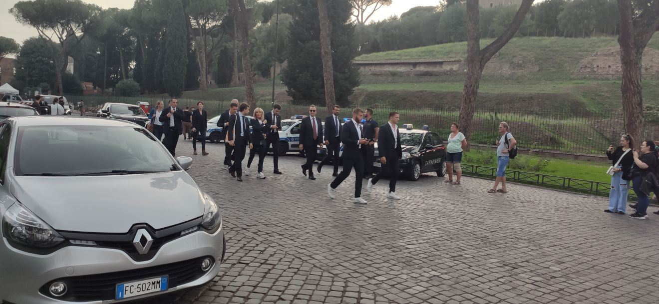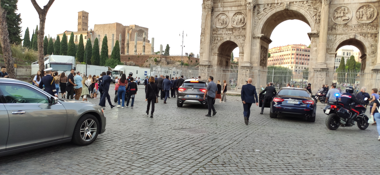Когда Никола и дети зашли в Колизей, я начал охотиться на покемонов на игровых аренах рядом с «самой настоящей» ареной. Но как места для новый монстров всегда мало, я сел рядом с аркой Константина чтобы освободить немного места. Это было идеальным местом с точки зрения защиты от карманников, потому что рядом со мной стояли по крайней мере четыре полицейских-карабинера. Однако через несколько минут спокойствие закончилось, и среди полицейских начался переполох. Сначала всех туристов прогнали с дороги (я сидел на краю и смог там остаться). Затем подъездная дорога была перекрыта (что сразу вызвало, как это в Италии и следовало ожидать, концерт гудков), и примерно через 3 минуты к нам примчалась колонна машин. Из одной машины вышла женщина, которую я не узнал, но было ясно, что «все её где-то видели».