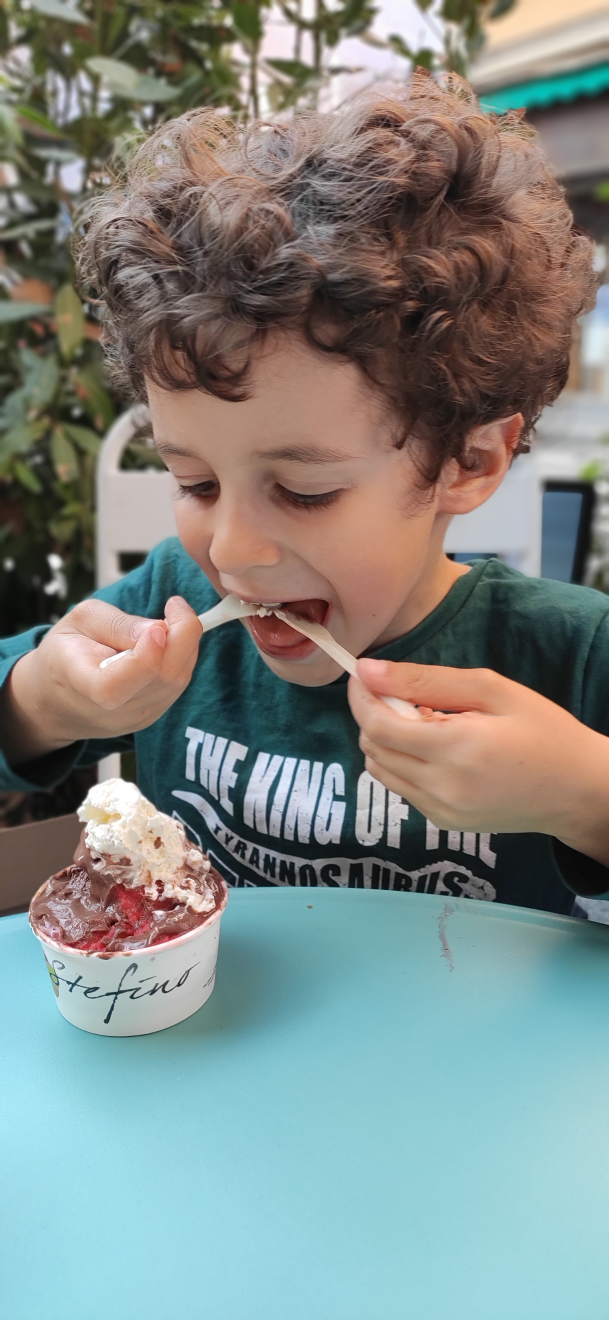 Во втором, довольно стильном Stefino Organic Gelato, есть „экологическиe“ и даже веганские сорта на базисе воды и рисового молока. Поэтому я действительно сомневался, имеет ли смысл туда идти или это просто результат современной необходимости в студенческом городе. Но на самом деле оказалось, что доля «немолочного» мороженного не такая уж и большая, много хороших сортов с настоящим молоком. Даже есть козье, не знаю, почему люди хотят есть из него мороженное. И они единственные, кто предлагает детям на мороженом взбитые сливки.