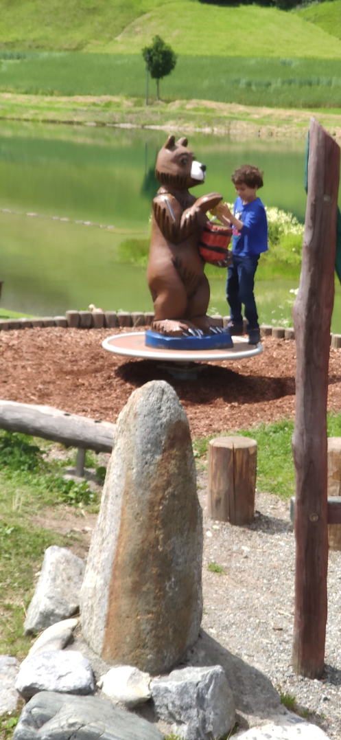 Ну и плюс ко всему, курс, к сожалению, был намного хуже, чем обещали. Ленивый класс не захотел собирать приправы, поэтому в итоге они просто играли на детской площадке, как-то делали из готового теста пиццу и начиняли ее готовым сыром и салями. И в итоге у Буни было еще достаточно энергии, поэтому мы поехали обратно в Ишгль, а оттуда прямо до средней станции канатной дороге на машине (там достаточно широкая дорога, никого джипа не надо). А оттуда пошли к Schwarzwasser See. С неплохой площадкой для скалолазания и, опять же, слэклайном!
